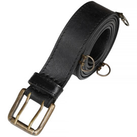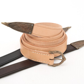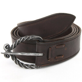 This type of buckles with elaborate openwork-panel extensions first appears in the last quarter of the 16th century. A belt of cowhide, brown or black, with a baroque, brass-colored buckle, which is sufficiently long for even a "well-built" buccaneer. Further product information ...