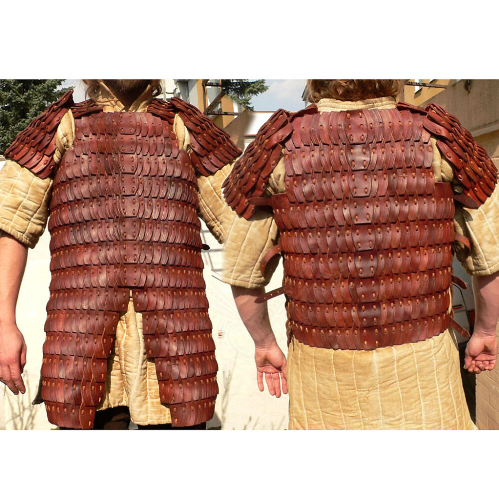 Lamellar armouris a kind of personal armour consisting of small plates (lames) which are laced together in parallel rows. Lamellar armour evolved from scale armour, from which it differs by not needing a backing for the scales. Lamellar was often worn as augmentation to existing armour, such as over a mail hauberk. The lamellar cuirass was especially popular with the Rus, as well as Mongols, Turks, Avars, and other steppe peoples as it was simple to create and maintain. Further product information ...