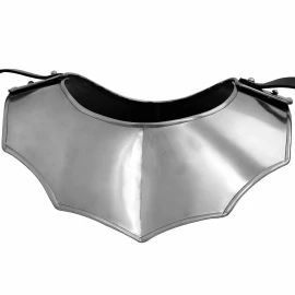 The gorget is articulated, meaning the neck section consists of moving lames. This allows you to tilt your head and look around comfortably. The extended front plate protects the upper chest and collarbones. It comes supplied with a leather strap at the bottom for attachment to a breastplate or placard, though this can be easily removed if not needed.
