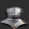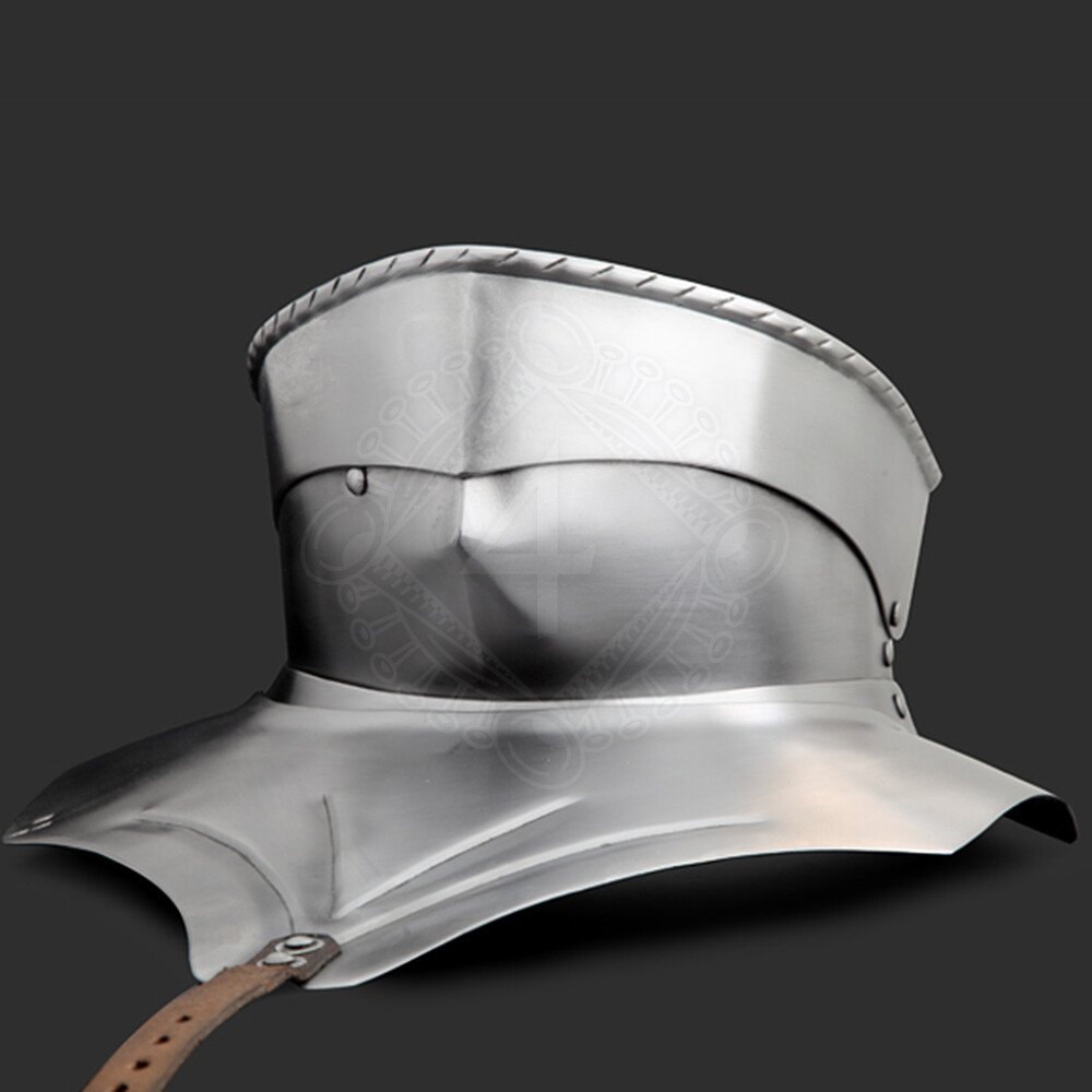 During the period from 1450 to 1520, armor design shifted significantly. The protection of the throat evolved from the rigid bevor (often attached to the helmet) to the independent gorget worn over or under the cuirass. This model reflects the skilled craftsmanship of German armorers, featuring a distinct rolled "roped" edge on the top lame. This is not just a beautiful decorative element; it serves as a deflector (stop-rib) to catch blades sliding down from the helmet, preventing them from striking the throat.
