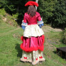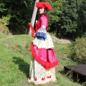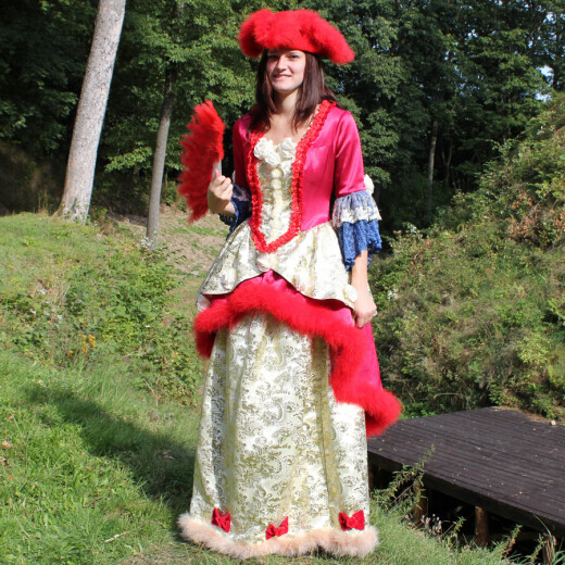 This robe is decorated with an elegant neckline and a planchette on the top. Both the upper and the lower skirt is lined with feather edge. The sleeves are decorated with richly ruffled top in two rows. This splendid robe is accompanied with a tricorne hat and a fan. Further product information ...
