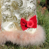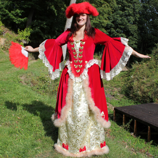 This baroque dress is richly decorated with lace. The frontal pointed planchette on the top is reinforced with underwire. The cut-in-circle sleeves are bordered with lace. The one-piece dress has a double skirt, the bottom edge is decorated with feather trim. The wide waist is padded with hip cushion (bum-roll). The hip cushion (bum-roll) can be padded with stuffing (90% PE + 10 acrylate), geotextile fabric or wool fleece. We use the staffing most often, as it can be washed at home. The wool fleece has to be dry cleaned at the cleaner's. This magnificent dresscomes with a tricorne hat and a feather hand fan. Further product information ...