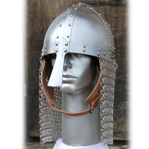 Become a fearless Norman warrior with this faithful replica of a conical helmet from the 11th century. This type of helmet, known as a Spangenhelm, is an icon of the Early Middle Ages and the hallmark of the warriors who changed the course of European history. The sturdy construction from four riveted plates, a prominent nasal guard, and a chainmail aventail to protect your neck and throat will provide you not only with an authentic look but also with reliable protection. This is the ideal choice for anyone who is serious about history. Further product information ...