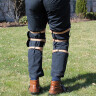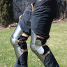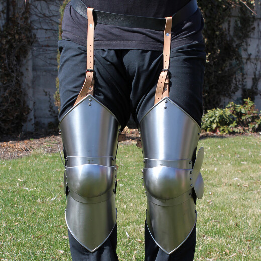 These cuisses and poleyns were designed to be worn without greaves. They are equipped with simple ears, and with four articulated panels above and below the knee cap. The knee cap is connected to four articulated panels above and below. The cuisses and poleyns are hanged on a leather belt; they are connected to the legs by means of six adjustable leather straps with buckles. Further product information ...