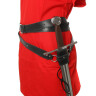 This simple sword belt is suitable for wearing of blunt swords or swords in scabbards. It consists of a long belt that is wound twice around the waist and a short sword frog. It looks as if it consisted of two belts. The two leather straps are connected with a leather loop on the opposite side to the sword. The sword belt is closed with a metal buckle. Further product information ...