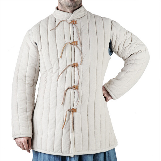 10xThis thickly padded gambesonis made of cotton canvas.The inside padding is also from 100% cotton. Thanks to its authentic appearance, this padded arming jacket is ideal for re-enactment, e.g. as an outfit in battles from the Gothic and Renaissance periods. Thanks to the thick layer of several layers of linen and cotton, you are perfectly protected and also warmly dressed in cold weather. This is a very popular model that we have sold hundreds of. This arming jacket is rarely returned, in most cases it is a matter of changing the size. From this we conclude that you will also be satisfied with the purchase. Further product information ...