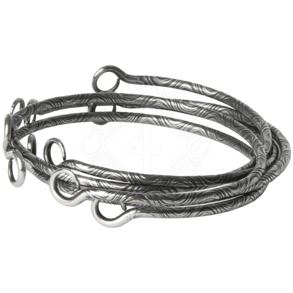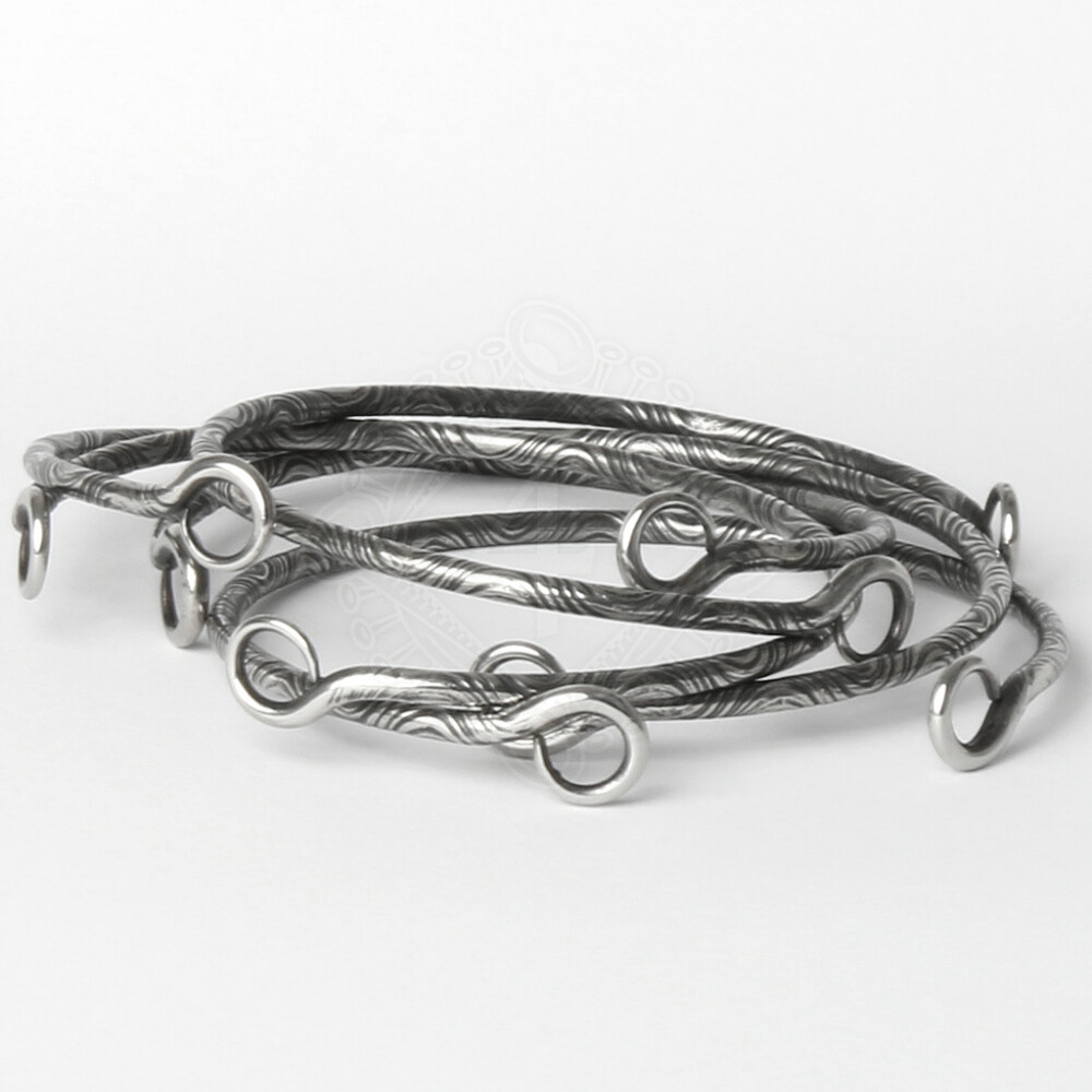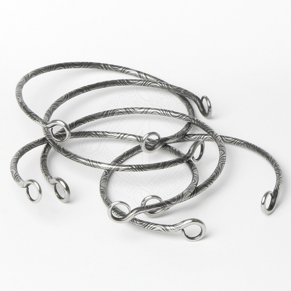 Hand forged bangle Manannan is available only in a one size fits all that fits most ladies. Its diameter is about 60mm. The subtle design corresponds to the low weight of about 7 g. The elasticity of the stainless steel and the circular ends allow an easy put on, not needing to without be afraid that the bangle slips from the wrist unintentionally.