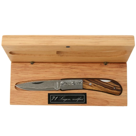 The blade of the Damascus knife consists of 71 layers of stainless steel, the core layer is made from steel 8Cr13MoV, also stainless. The bolster is also made of Damascus steel. Locking takes place by means of classical Lockback. Further product information ...