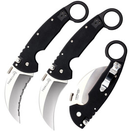 The blades are made of 420 stainless steel, coated black and are locked with a liner lock. The handle is made of aluminum and has a belt clip on the back.