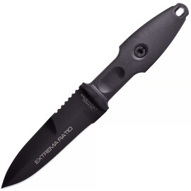 The blade is black-coated, made of 1095 carbon steel (not stainless). The handle is made of kraton.