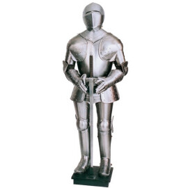 • Complete Set: The armor includes a close helm (armet) with coloured plumes, a two-handed sword that the knight grips in his gauntlets, and a solid stand made of polished hardwood.