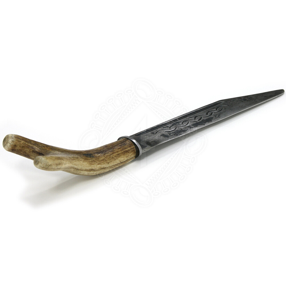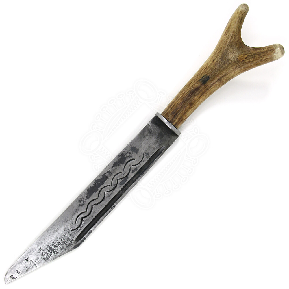 The seax blade is made out of of forged, oil-quenched spring steel and is not stainless. The blade has natural forged, light burnished finish. The handle is made from genuine deer horn. Please note that the shape and colour of the deer horn differs from piece to piece according to the availability of this scarce natural material.
