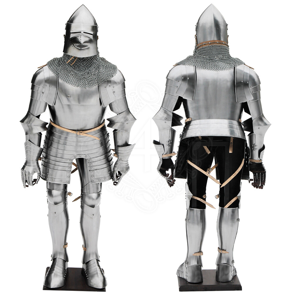 The trunk covers the front, back plate and front fauld of lames that could be unbuckled before riding. The front plate is reinforced with a second plate at the top. The wide pauldrons are finished with split hoops on the cuirass. The head is protected with a Hunsgugel-Bascinet with an aventail (mail collar).