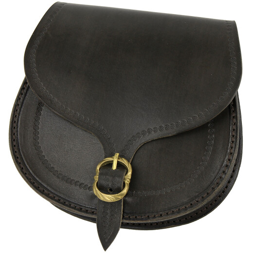 This simple belt bag Germbrand is made of genuine cowhide. Its flap is decorated with simple floral embossing on the edge. The bag closes with a brass buckle. It is worn on wide belt.
