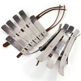 1xThis type of splinted guards dates back to the 9th century. It was designed according to archaeological finds in Valsgärde. They were quite common but the warrior's financial means were also of importance in this case. They protected their wearer against undesirable sword blows. Vikings knee and shin guards are made of 2mm thick hand forged iron bars. Further product information ...