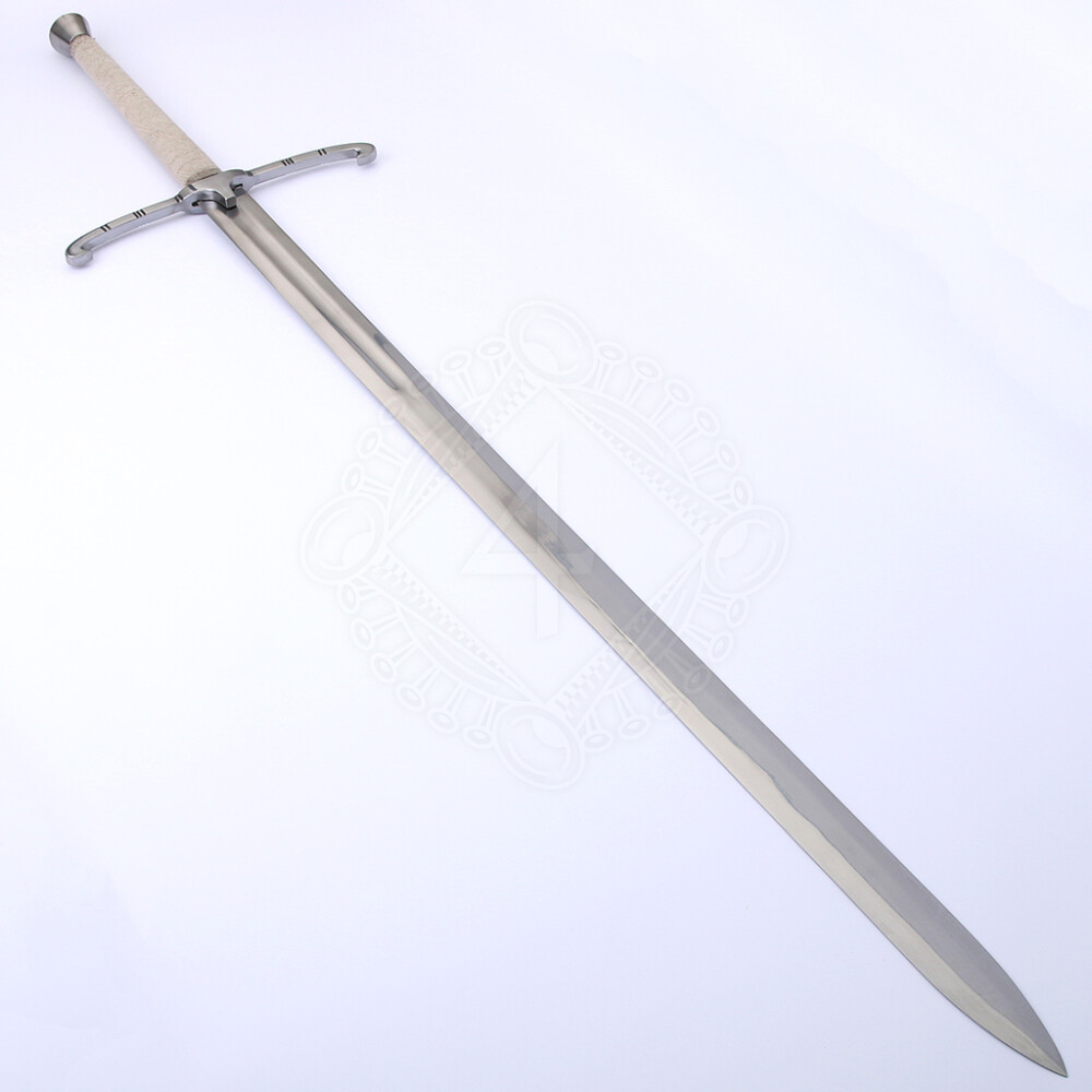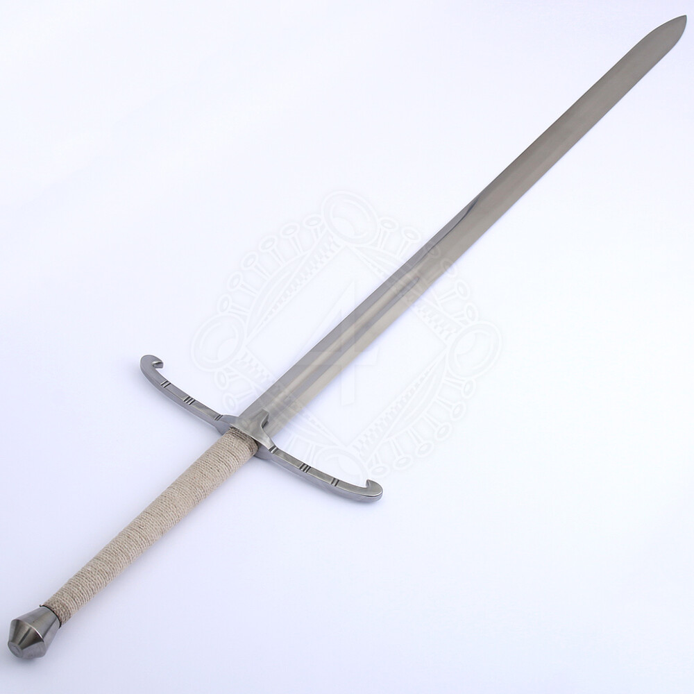 1xThis massive Lowland Claymore is like one held by the Bruce clan which they assert belonged to Robert the Bruce himself. It is certainly the correct type for that age when knights wore mail, barrel helms and some small pieces of plate, just as the Bruce did. This type of huge sword could wreak havoc on that type of armor. The long blade is fullered and of a flattened cross section and is fully tempered high carbon steel. The cross-section and pommel are steel and the long grip is hard wood wrapped in cord for a good grasp. Large swords like this were not worn but carried over the shoulder with the flat of the blade down without a scabbard during this period. Further product information ...
