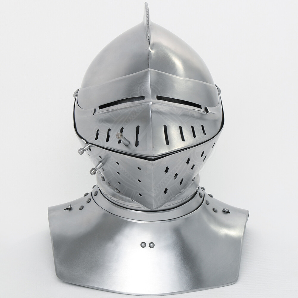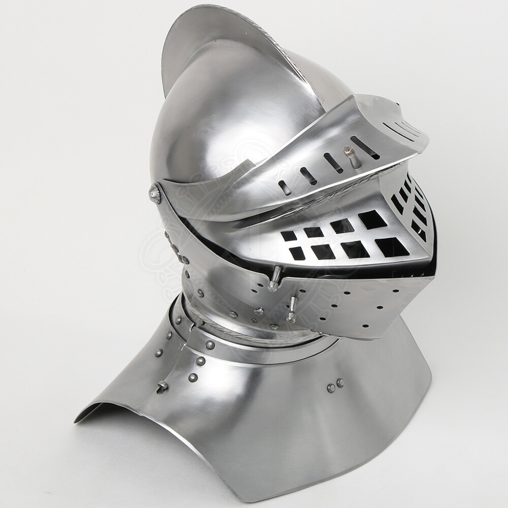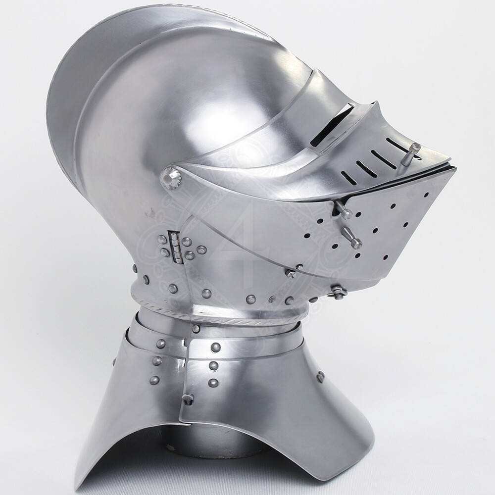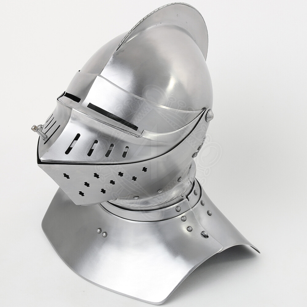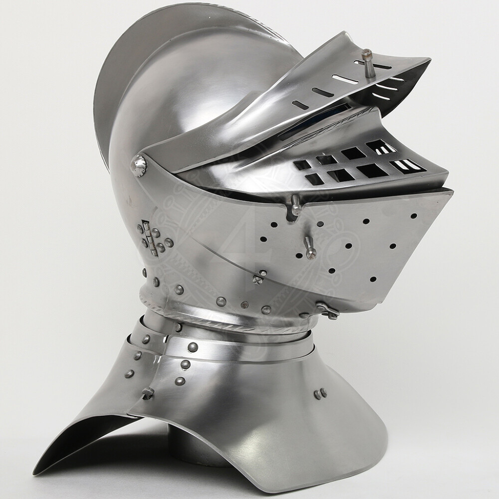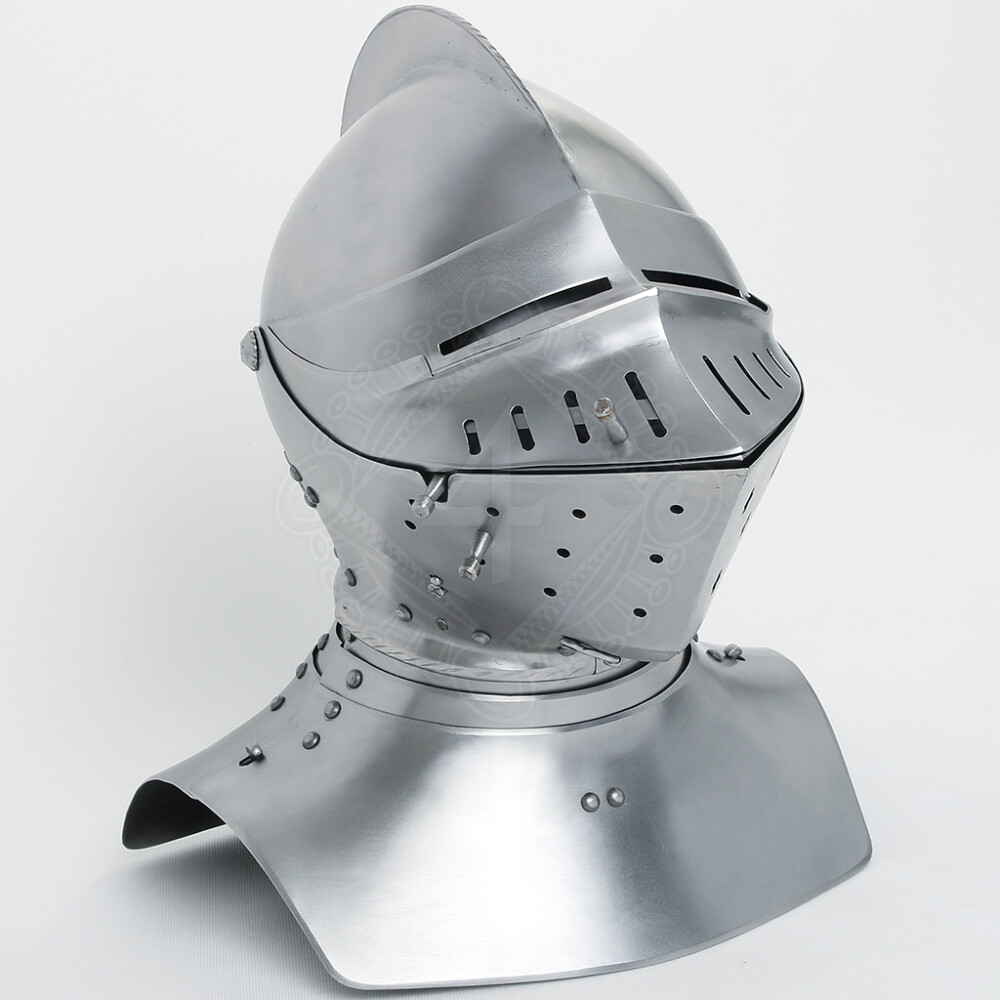 The skull of the Armet helmet consists of two welded hand-hammered parts and a crest with roped top. Pivoted pointy three-piece-visor is laterally provided with pins. It is on both sides perforated with eye slits and breathing holes. Two-piece hinged cheek plates are secured with a peg-and-hook-lock against self-opening during the fight. The lower rim of the armet is also roped and closes over a flange in the upper edge of a gorget. The helmet can then rotate without allowing a gap in the armour. Further product information ...