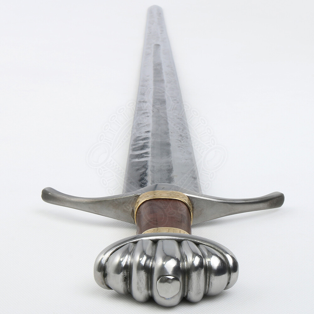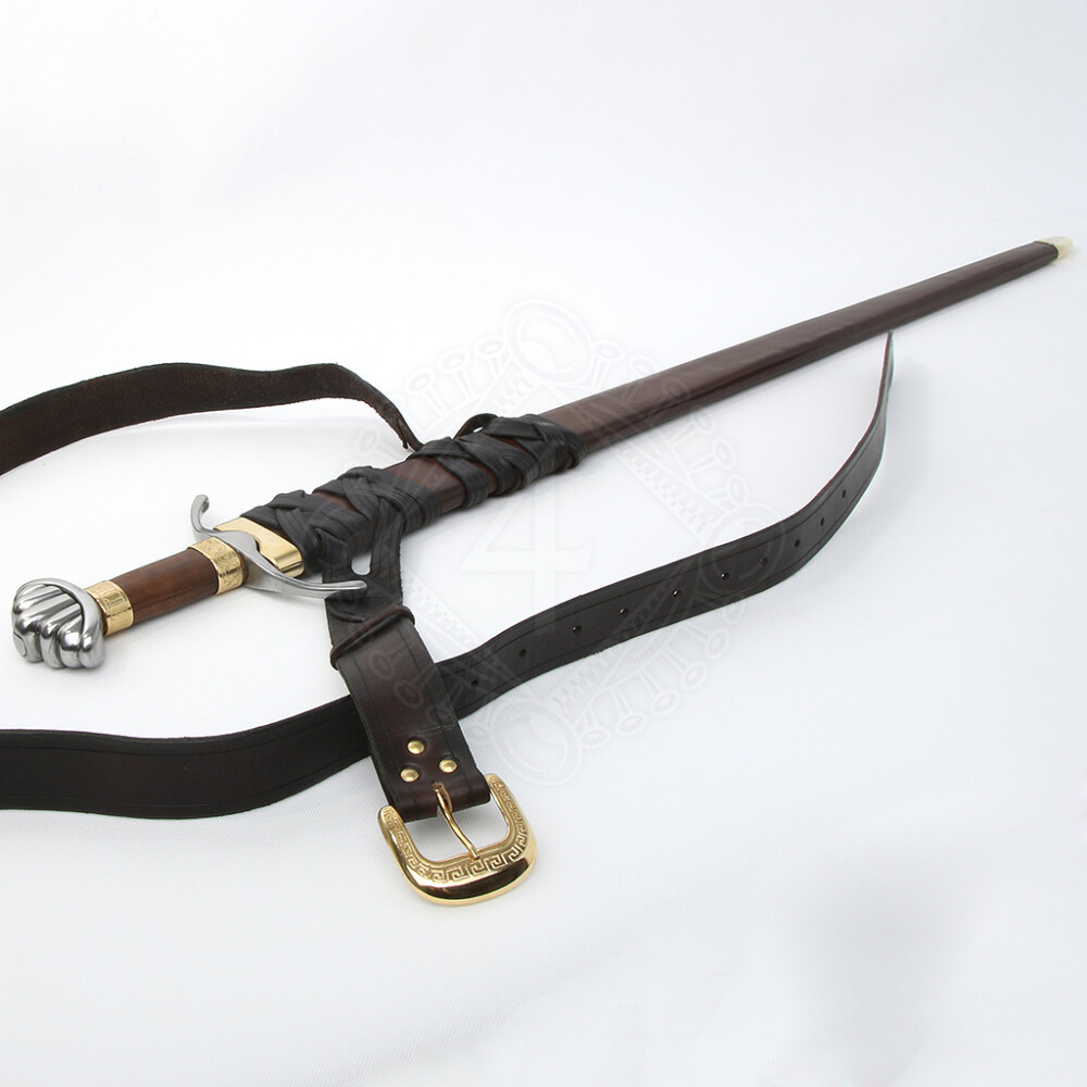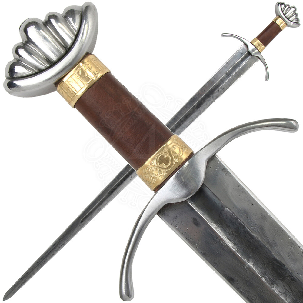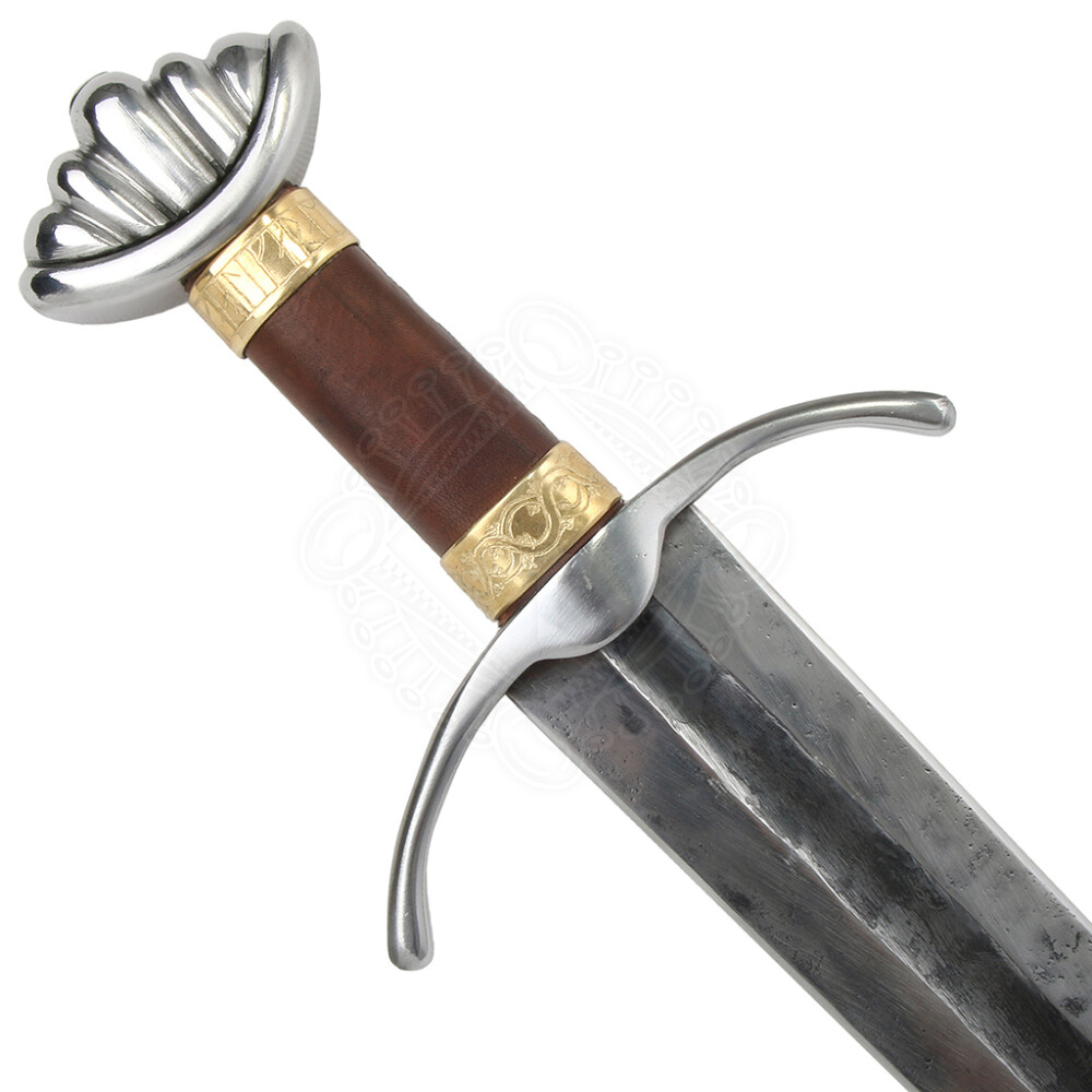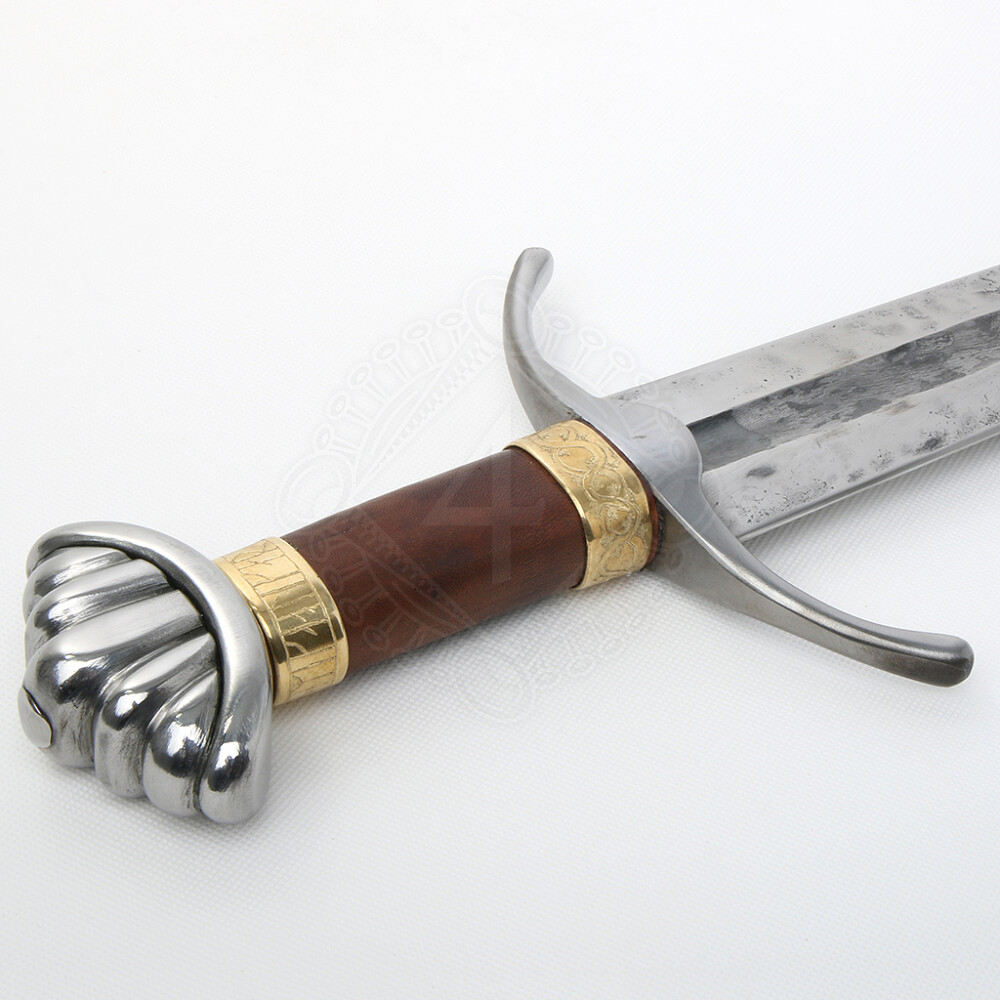 This reconstruction of the Korsoygaden sword was made after the original that was found buried in a stone cyst with the remains of its scabbard and a shield. This simple yet attractive Viking sword is named after where the sword was originally found – Korsoygaden. It has a broad blade a curved crossbar hilt and a distinctive ornate pommel decorated with ridges. Both the guard and the pommel are made from polished carbon steel. The grip is wrapped in genuine brown cow leather and decorated with two engraved brass sockets. The blade features a long, deep fuller. It is available with optional matching scabbard with polished brass fittings at the throat, chape and a buckle. Further product information ...
