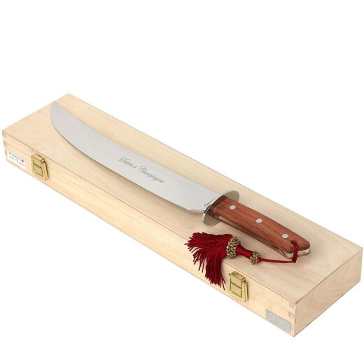 This simple version of the champagne sword is suitable for opening of bottles of champagne and sparkling wine. The blade tang goes fully through the handle. Segments of hardwood are riveted on both sides and form a solid grip. At the end of the handle there is a hole where a wine-red tassel is attached. Unlike traditional champagne swords, this version has no hilt over the grip and just a short hand guard at the blade. Further product information ...