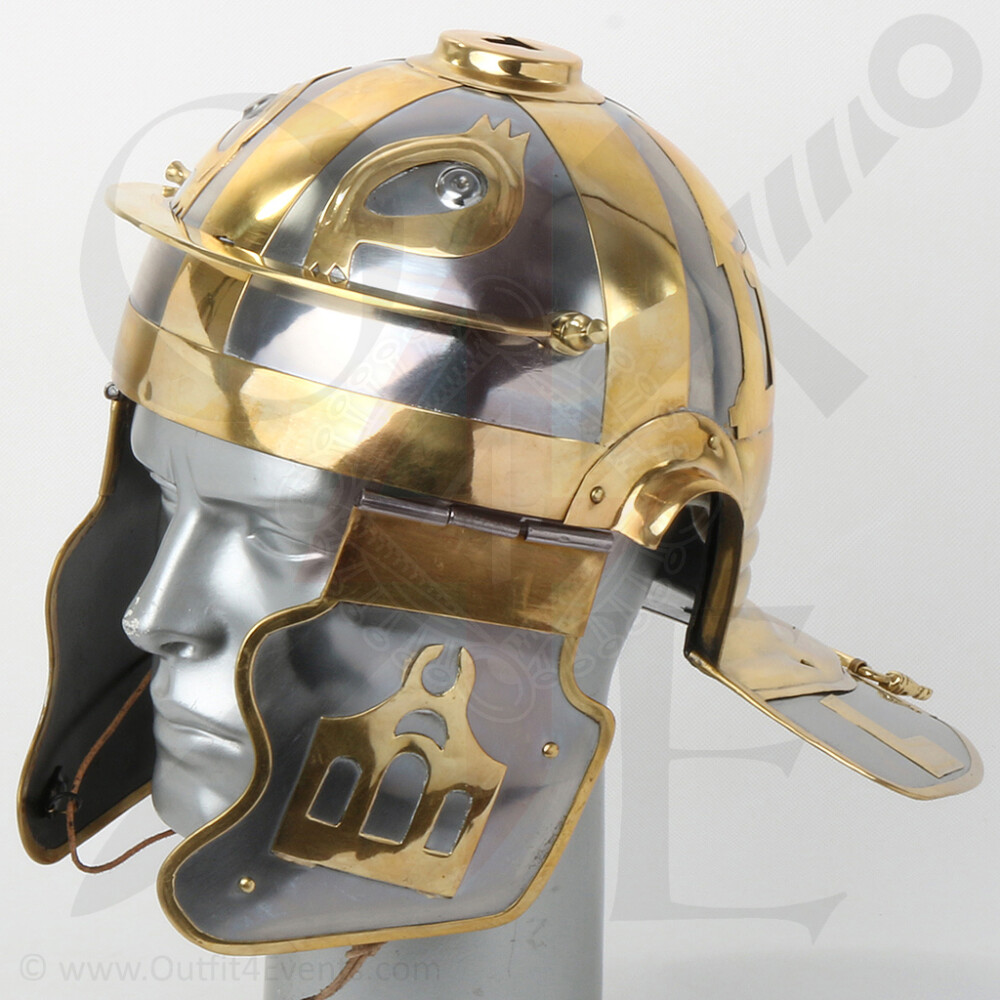 Since the original's jowl flaps were missing, they are designed here following the Imperial Italic D helmet from Worms.