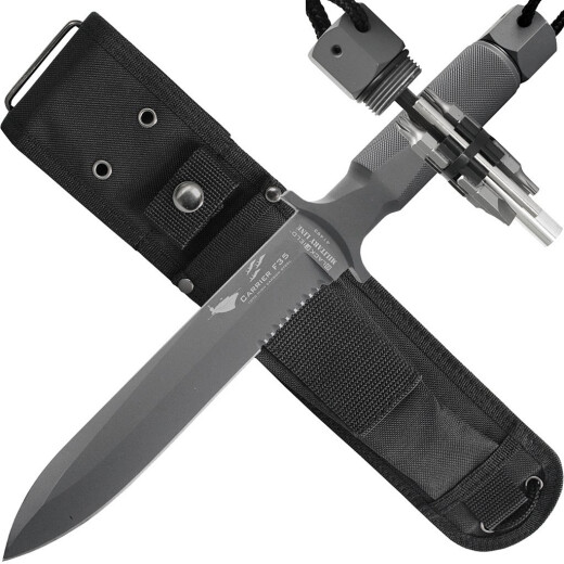 This survivor knife has a galvanized, spear-point-shaped blade from high-carbon steel 1070 (not stainless). In the screwed hollow metal handle are inserted various bits. The nylon sheath has a plastic quiver to hold the blade, and a front pocket for small objects. Further product information ...
