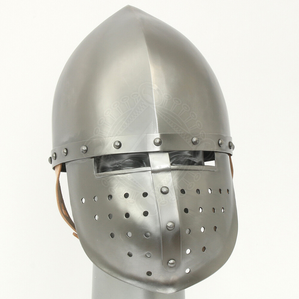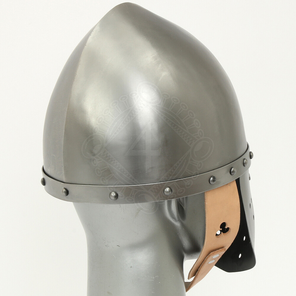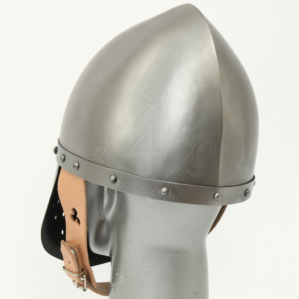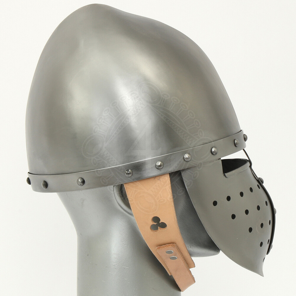 This Cabaset with large facial guard is hand-hammered from rusting steel plate. It comes with leather chin strap. Its weight depends on the chosen gauge of plate and size. Size XL from 1,5mm thick plate weighs approx. 1.8 kg. Further product information ...