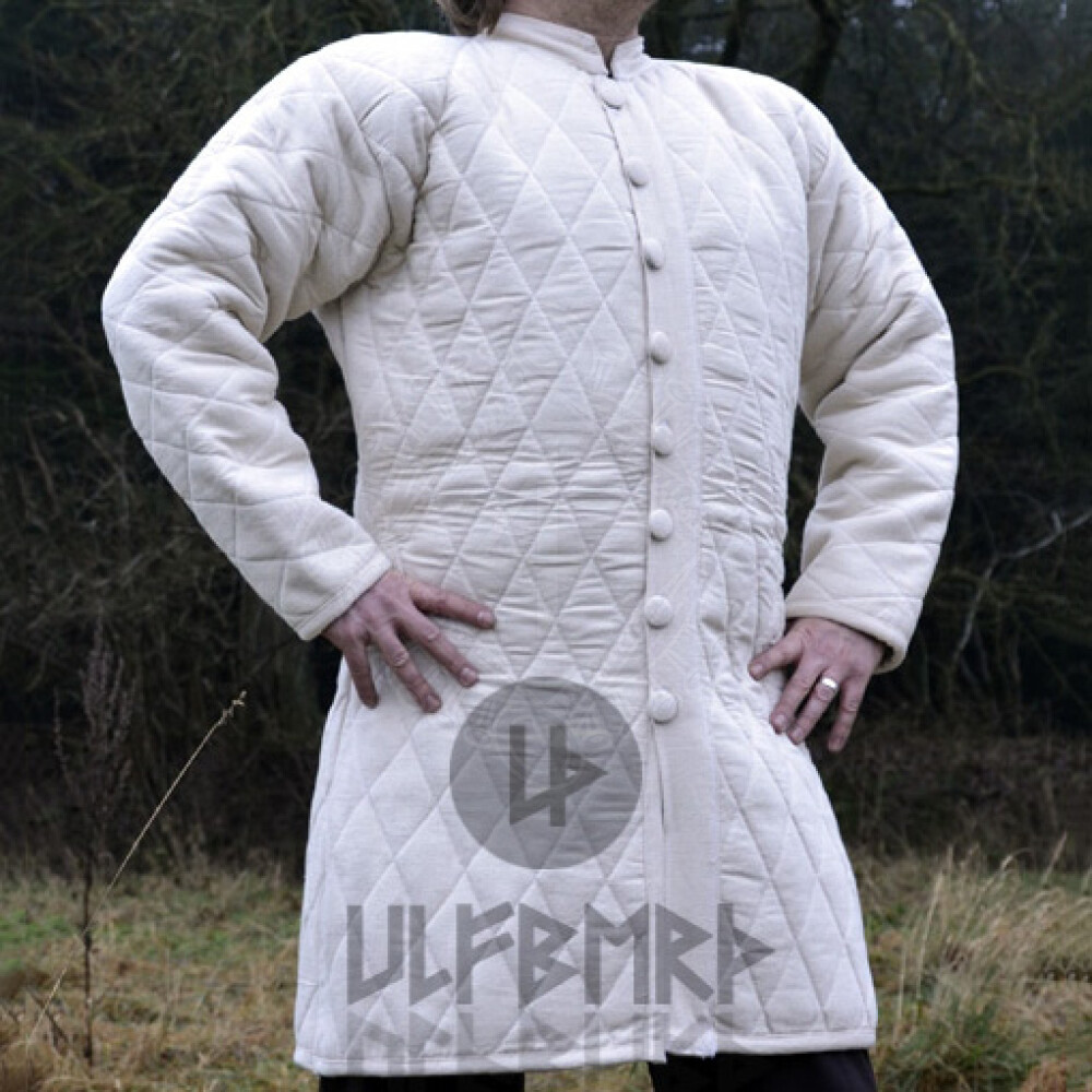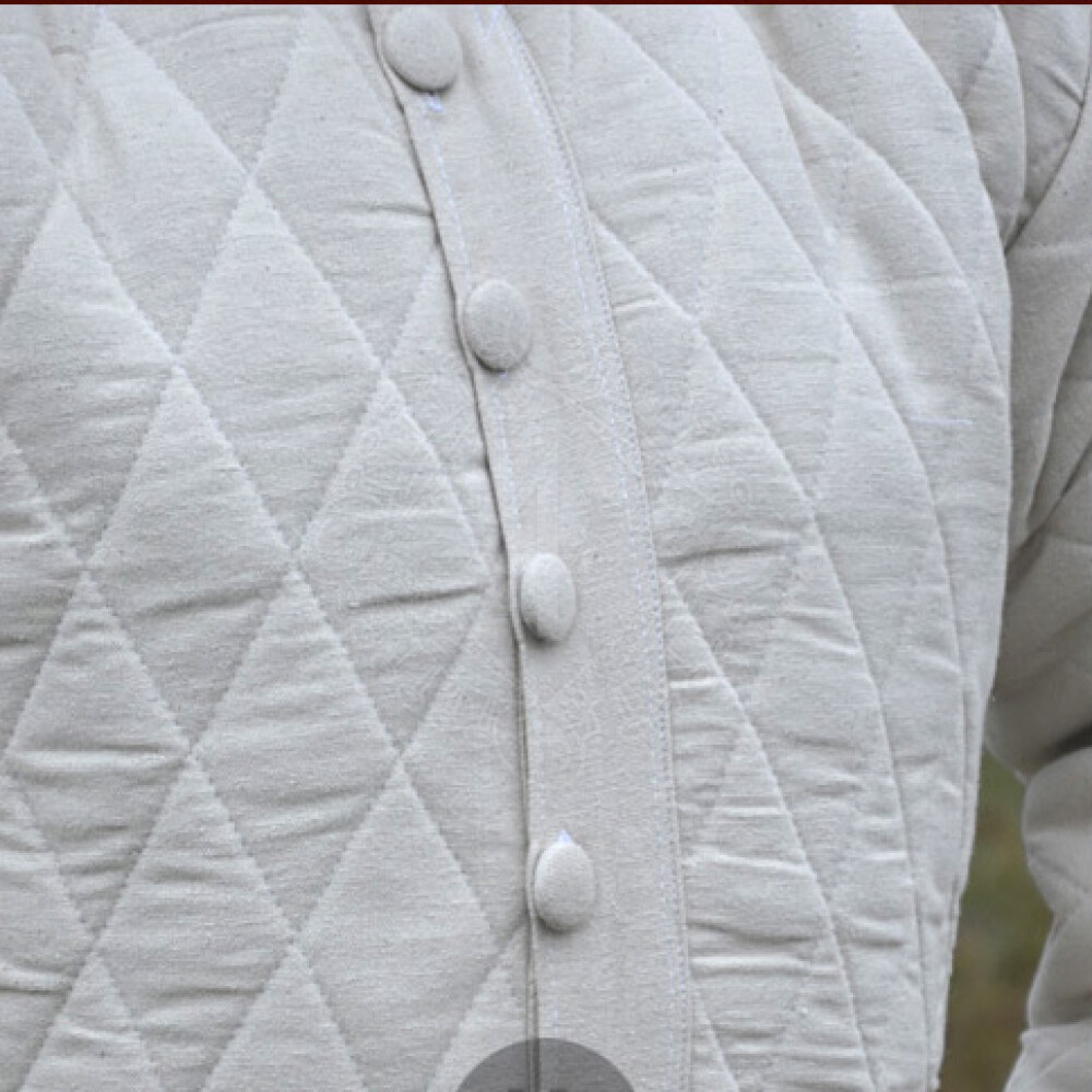 A gambeson is almost indispensable for re-enactment and medieval show fighting. The gambeson, also called aketon, padded jack or arming doublet was often worn underneath maille and plate armour. It made the wearing of these steel armours more comfortable for the knights. This Ulberth® gambeson is made from four layers cloth: two layers of a woolen padding, an outer layer of canvas (100% cotton) and an inner layer of soft cotton. Replicated after a late medieval arming jack this gambeson features a waisted cut and cloth-covered buttons. Further product information ...