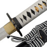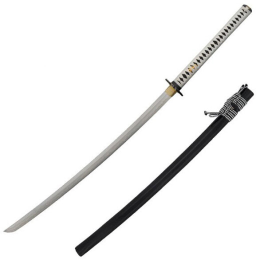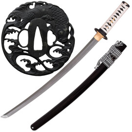 The Koi Katana from Paul Chen has a hand-forged T10 high-carbon steel blade. The blade on this katana is differentially hardened using the traditional claying method. The Koi Katana is mounted in black and white and features black same, the tsuka-ito is made of premium white Japanese cotton. The saya is finished in a deep black lacquer with a black and white striped cotton sageo. A finely rendered Koi, with true front-and-back detail, forms the black iron tsuba. The fittings are superbly antiqued adding to the aesthetics of the piece. The Koi katana from Hanwei is supplied with a protective cloth bag and traditional maintenance kit. It is said that a Koi swims up rivers and climbs waterfalls with bravery not unlike a Samurai warrior. As well, it is said that if a Koi is caught, it will lie still beneath the knife, facing its death bravely like a Samurai facing a sword. Further product information ...