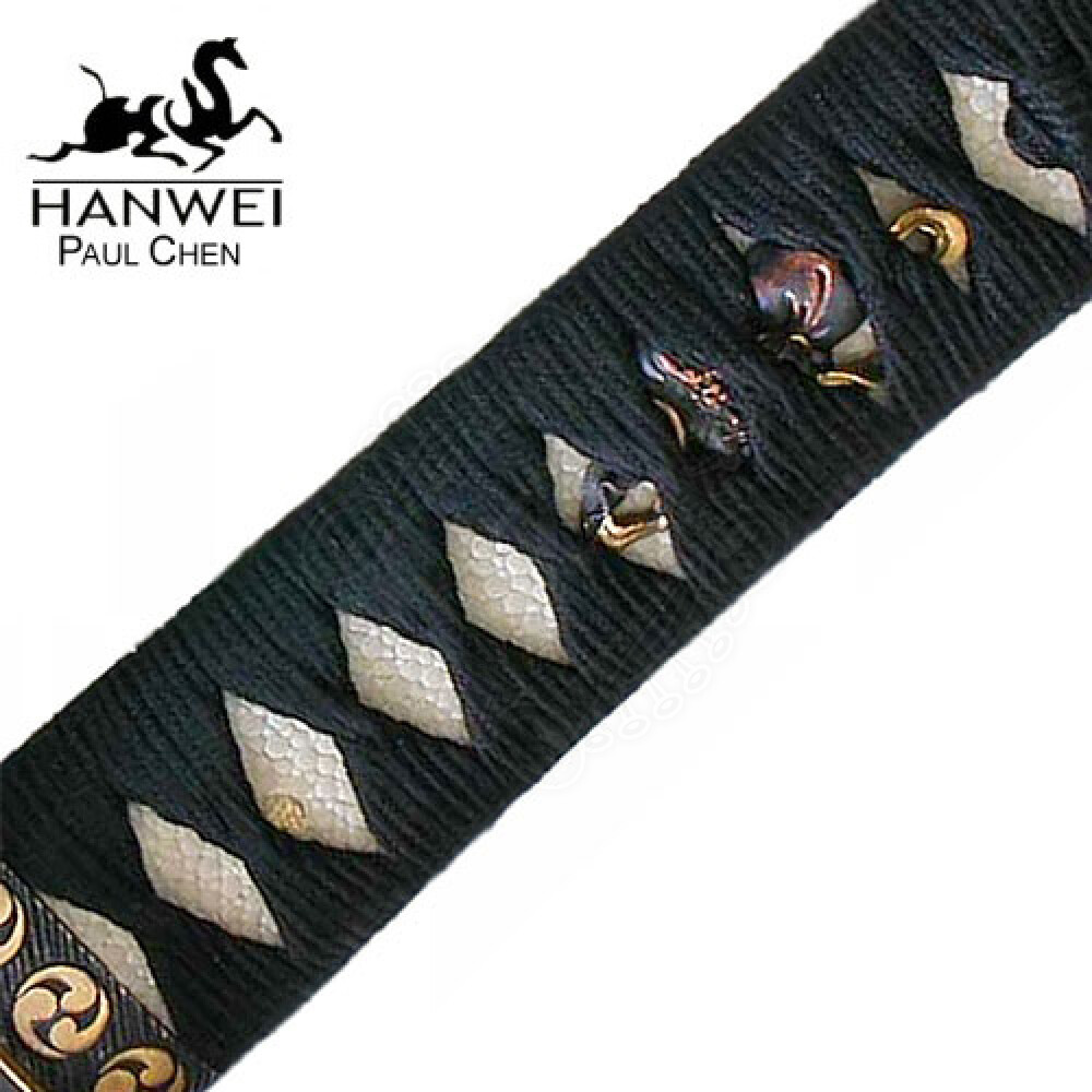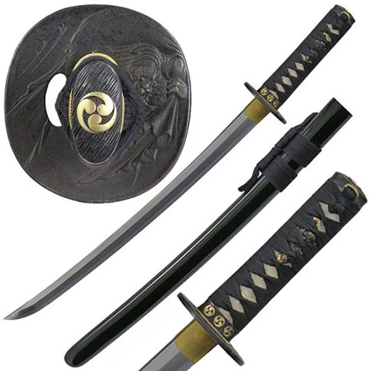 The Wind and Thunder Wakizashi features a Raiden tsuba, crafted in black iron, and the fuchi and kashira feature a Tomoe motif . The tsuka is wrapped in genuine same (ray skin) and the tsuka-ito is premium Japanese black cotton. The saya is finished in a traditional black laquer with a black cotton sageo. Further product information ...