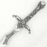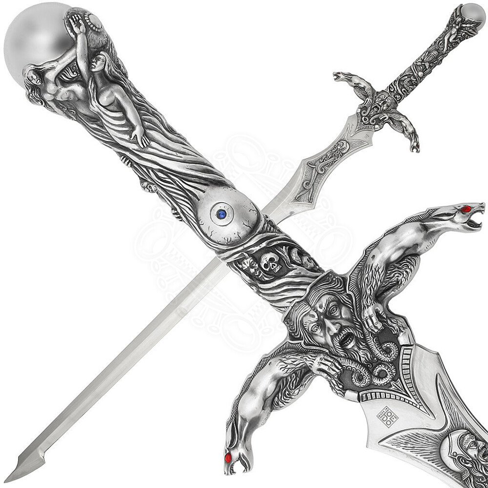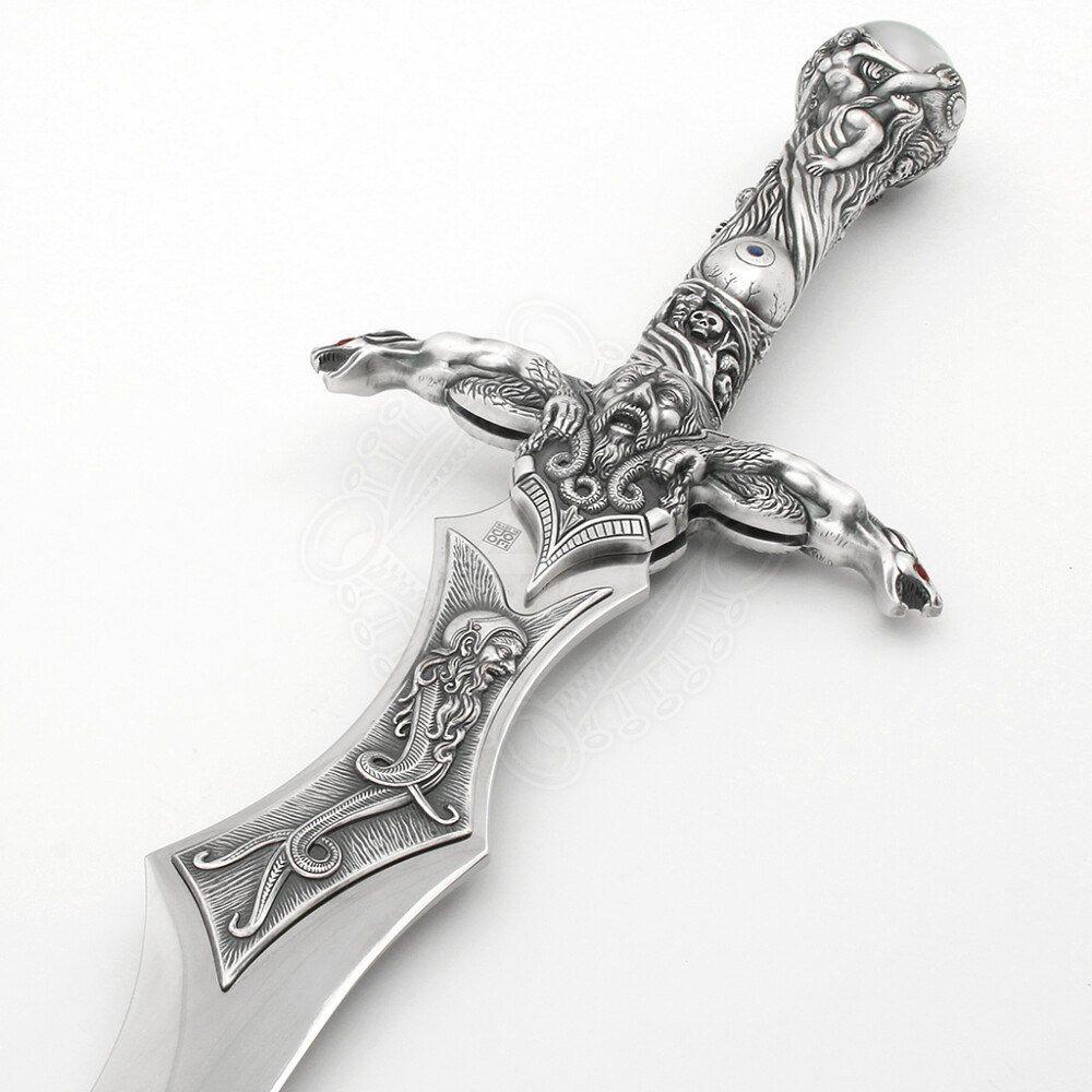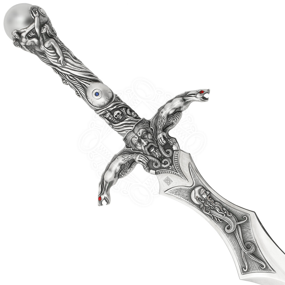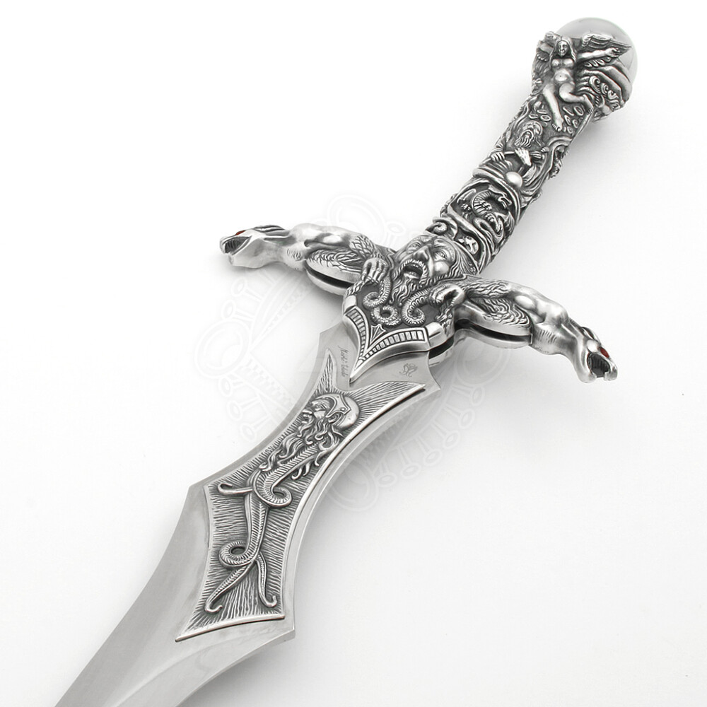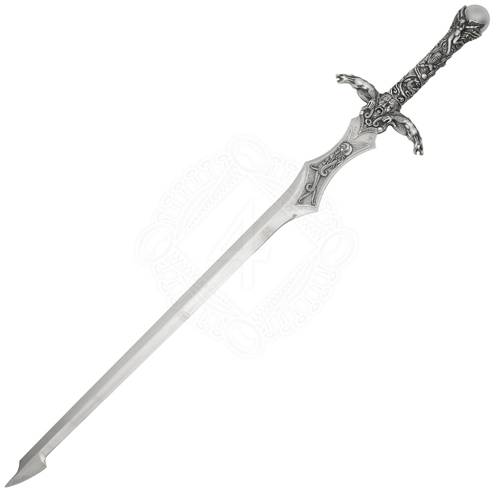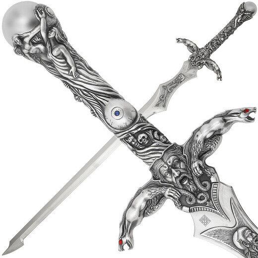 At first glance, you will be captivated by the unusually shaped blade and a hilt that is literally covered with Celtic emblems and mythological scenes. The hilt is cast from Zamak alloy and features a luxury silver finish that highlights the detailed engravings of figures and dragons. The dominant feature of the sword is Merlin's magic sphere set into the pommel, supported by stylized figures, giving the weapon a mystical appearance. The blade, made of high-quality AISI 440 tempered stainless steel, features a specific widening near the guard and a unique tip, making it an unmistakable decorative piece.