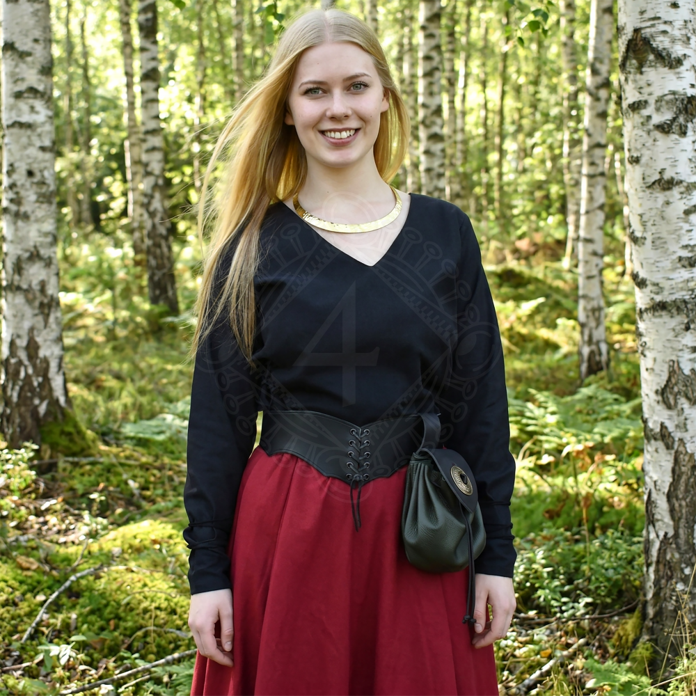 Are you seeking a piece of jewelry that bestows an aura of nobility and primal elegance upon your historical costume? This broad, flat torques is exactly the accessory that can visually elevate a simple tunic to the level of a wealthy Jarl or a respected woman of the Viking Age. Thanks to the hand-hammering process, the surface possesses an unmistakable texture that plays with light across thousands of tiny facets. Brass was immensely valued in history for its golden hue, and we bring it to you in a form that is not only beautiful to behold but also practical for wear – unlike bronze, brass does not leave dark stains on the skin. Let yourself be captivated by the magic of ancient times and adorn your neck with a symbol of power and freedom. Further product information ...