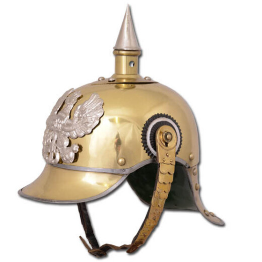 Replica of an original Prussian helmet from 1889, known as the Pickelhaube. The frontal relief depicts the prussian eagle with the German Text: "Mit Gott für Koenig und Vaterland" = "With God for King and fatherland". Further product information ...
